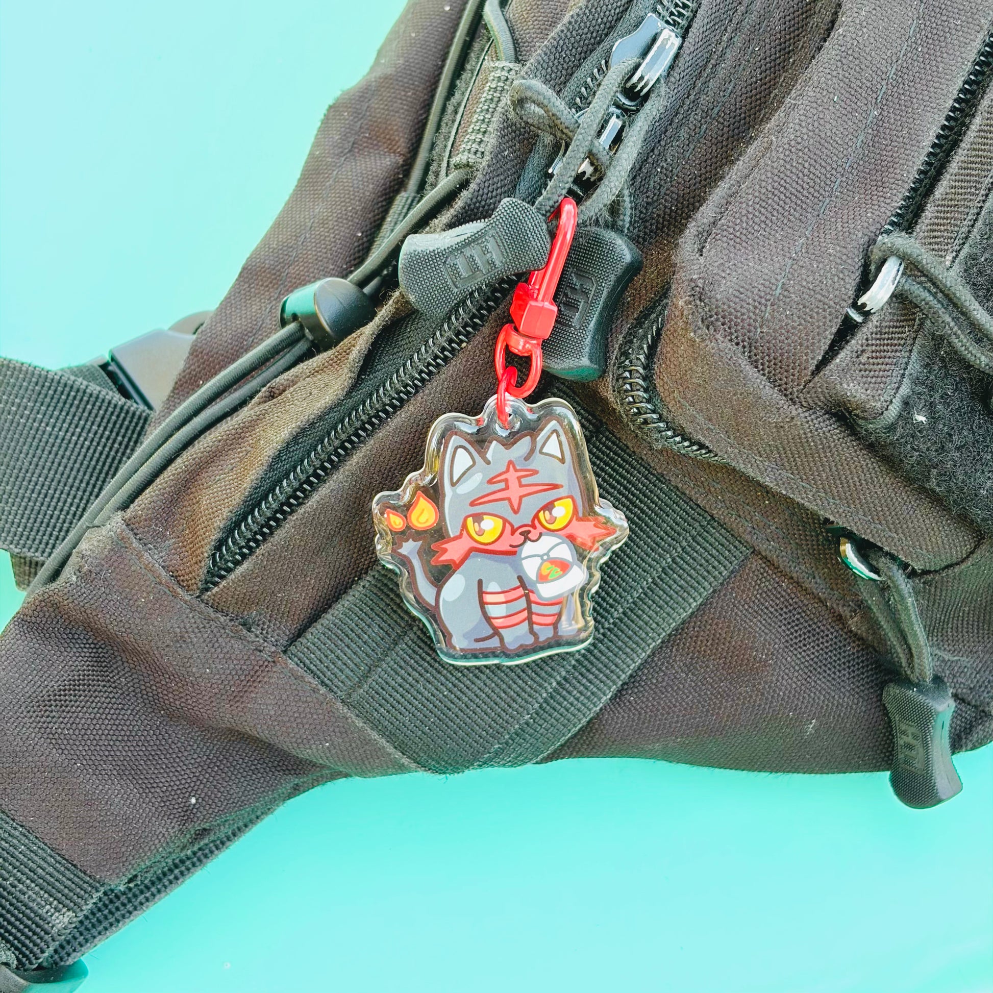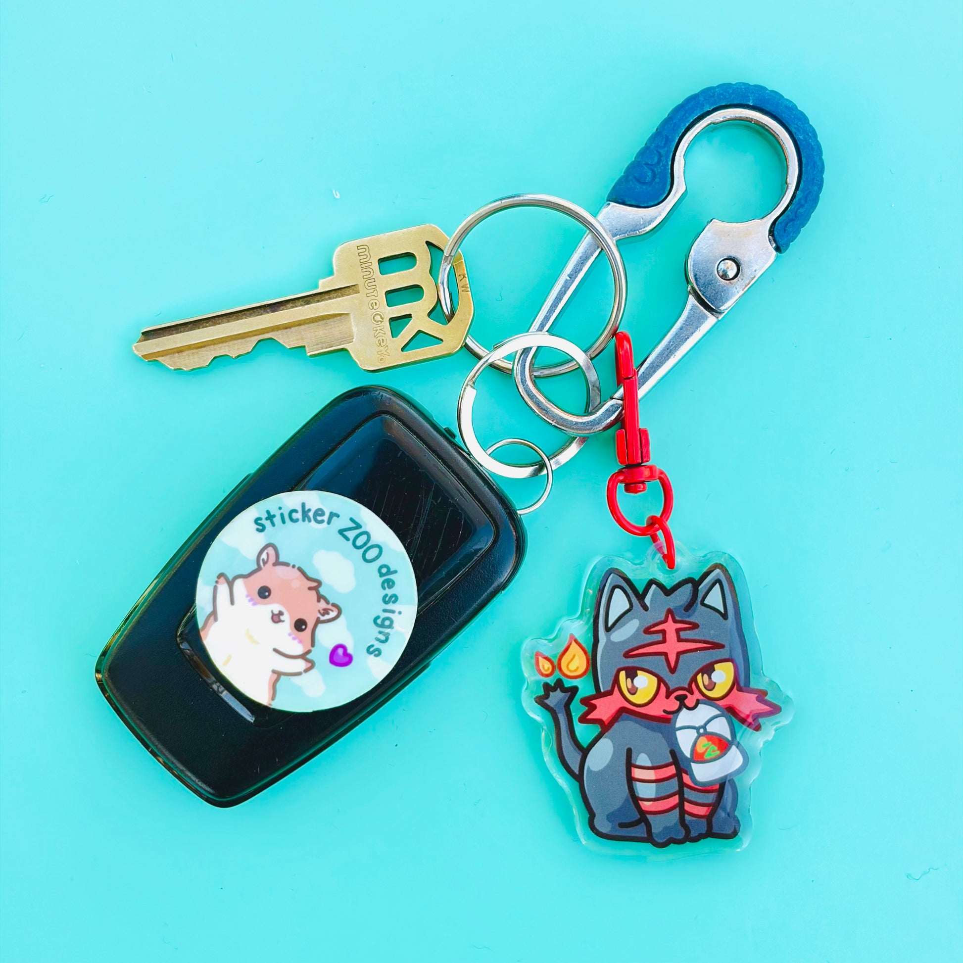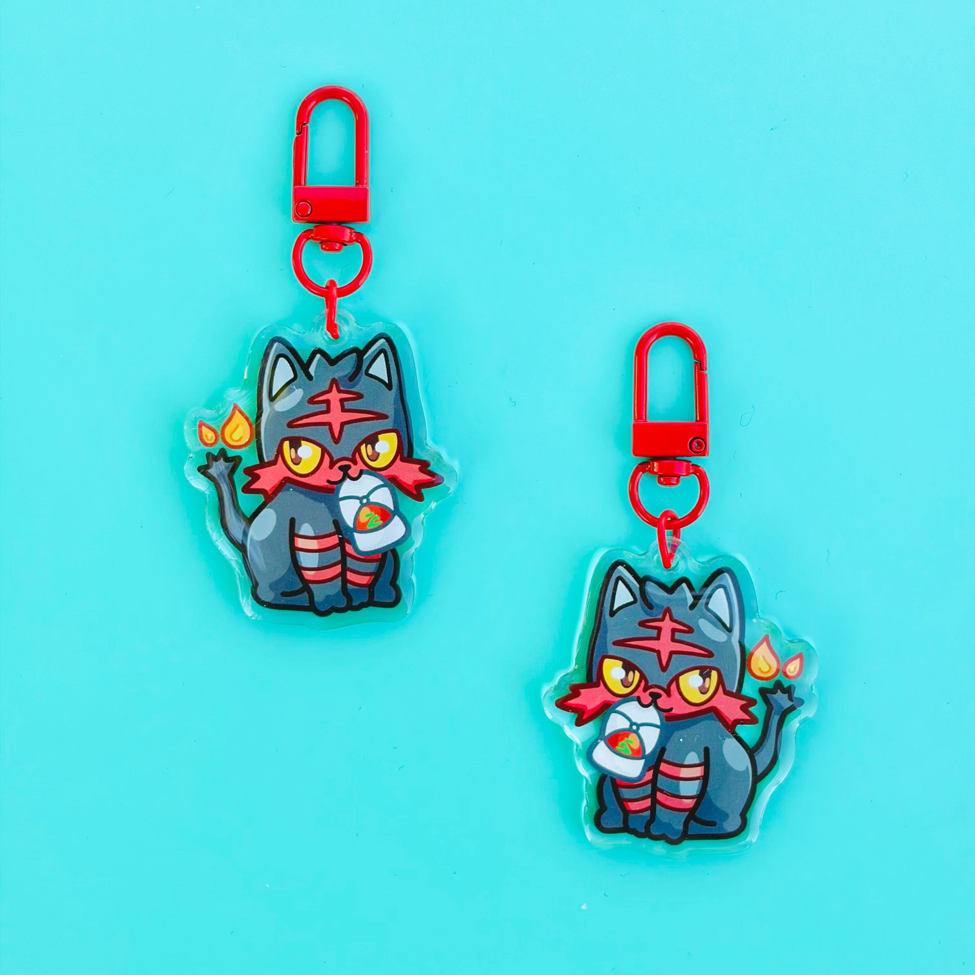 • Double-sided acrylic epoxy keychain with red clip.