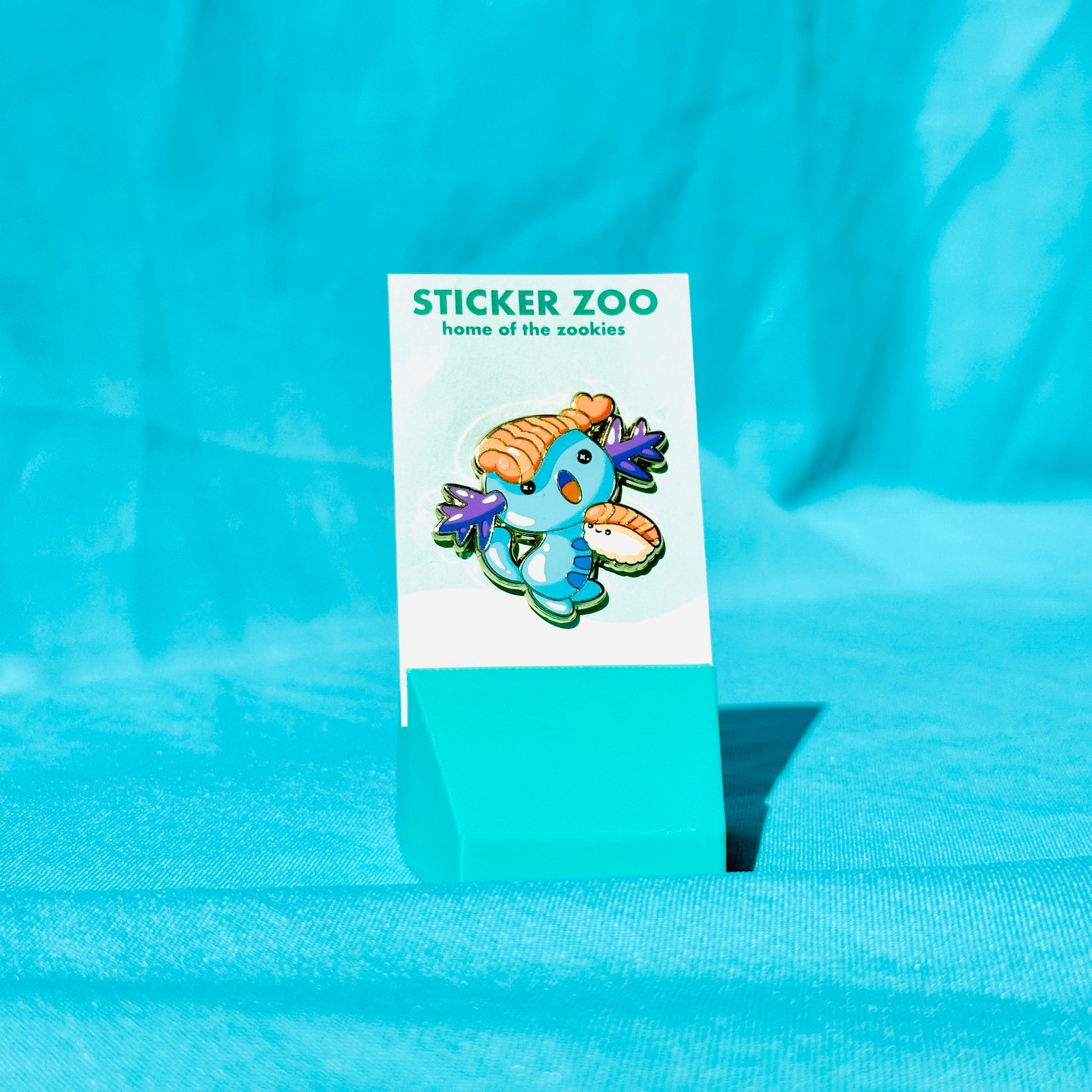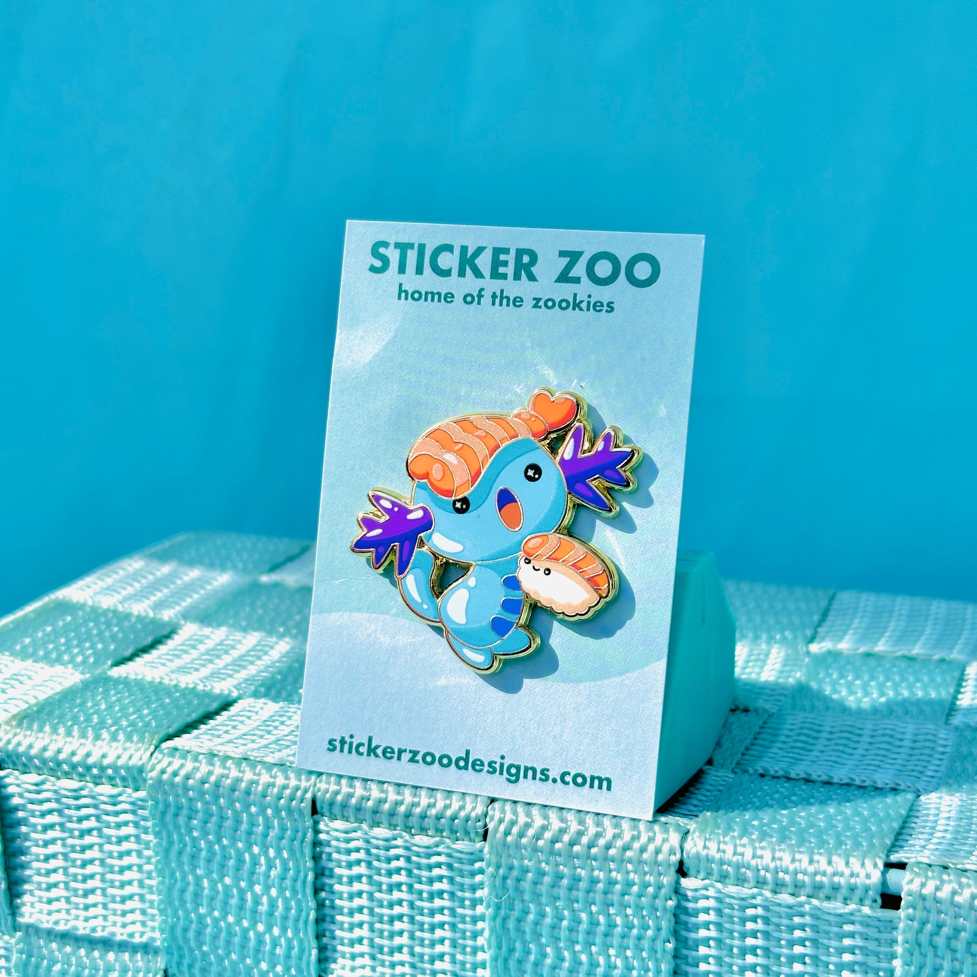 Gold-color, hard enamel pin based on a popular blue axolotl surrounded by sashimi. It's not cannibalism but it is suspicious... Woop-dee-doo