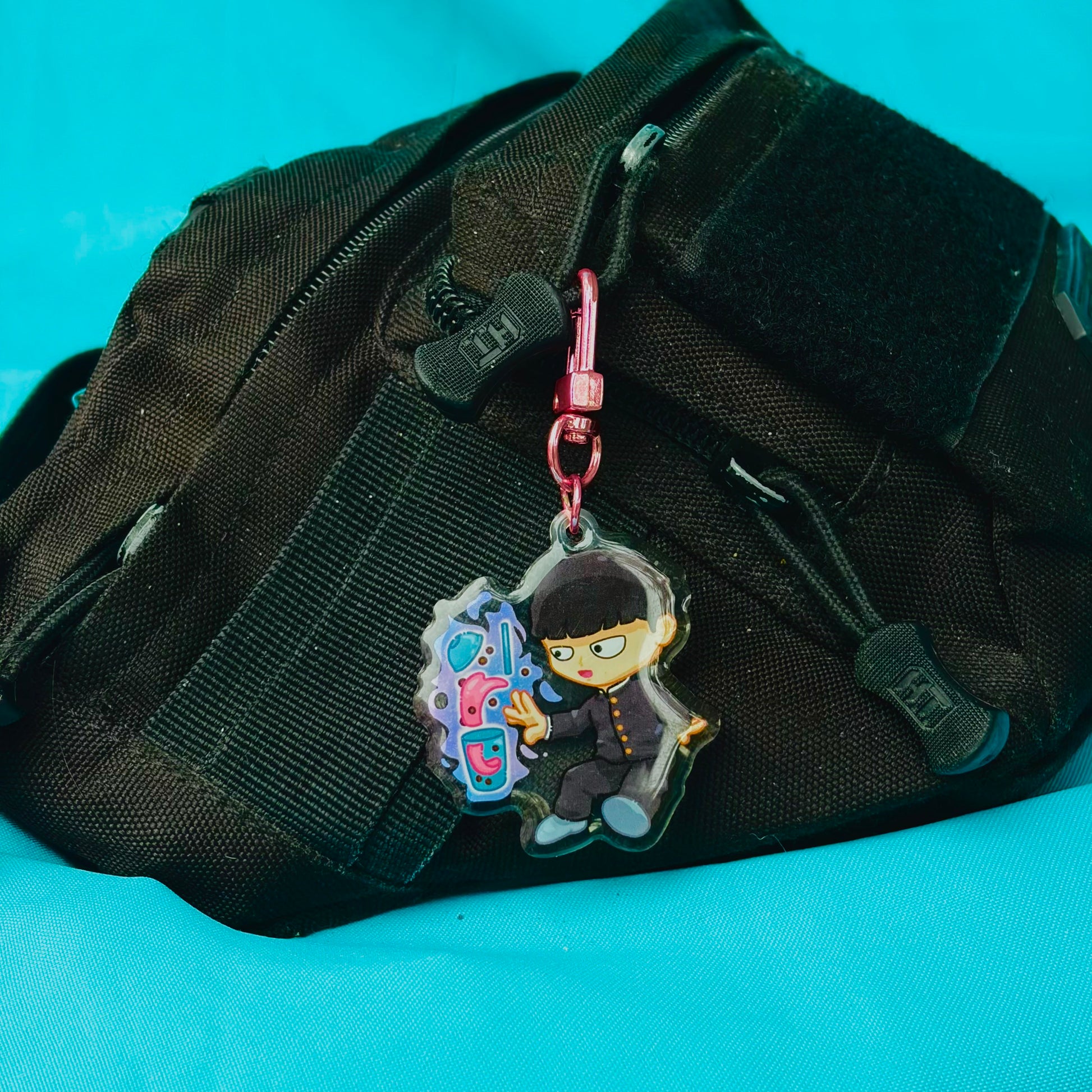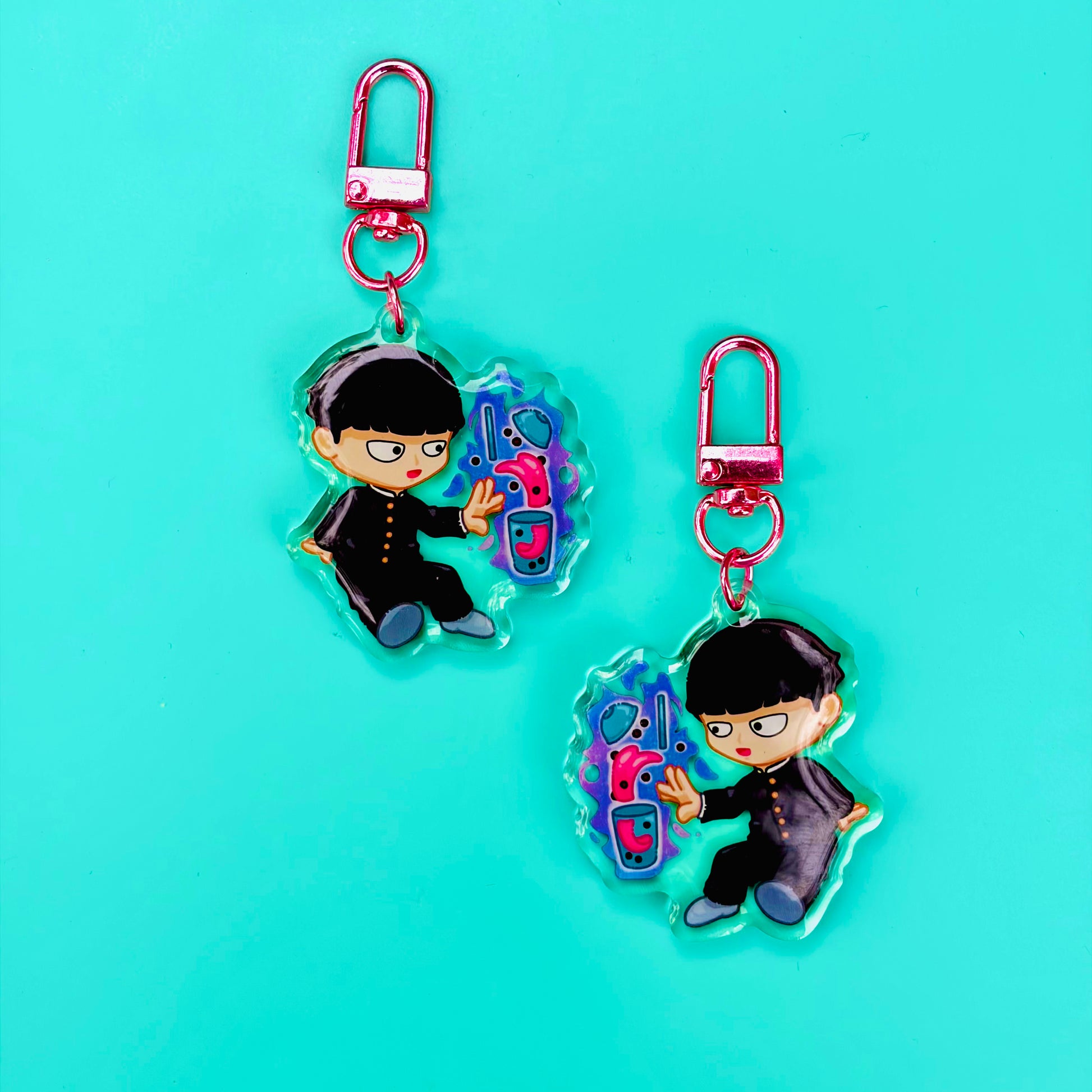 • Double-sided acrylic epoxy keychain with clip on shiny pink chain