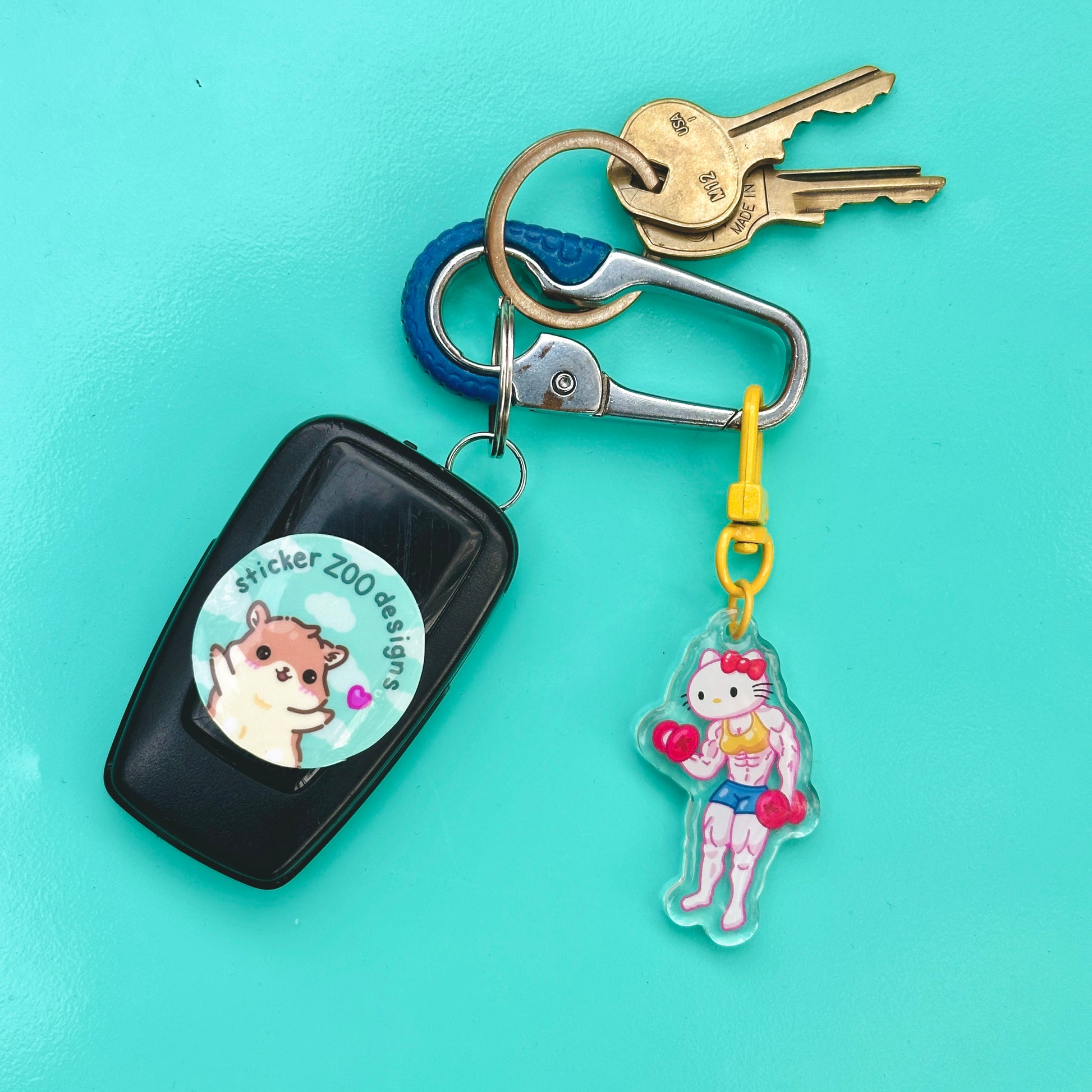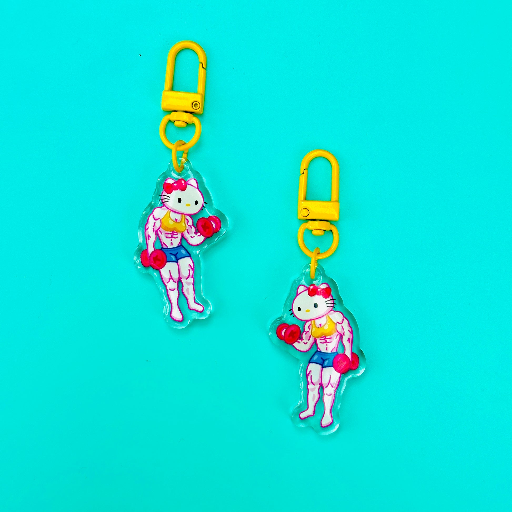 • Double-sided acrylic epoxy keychain with yellow clip.