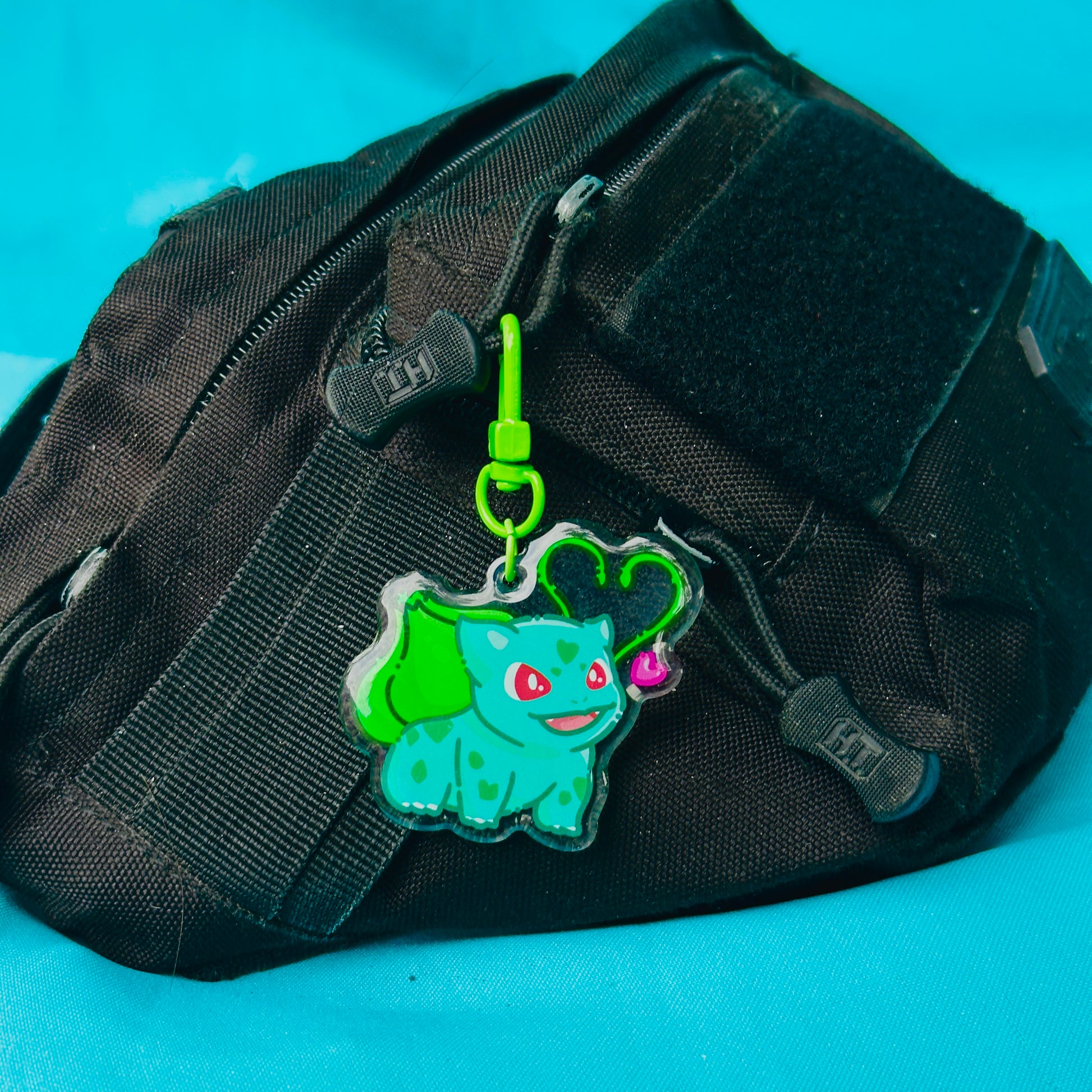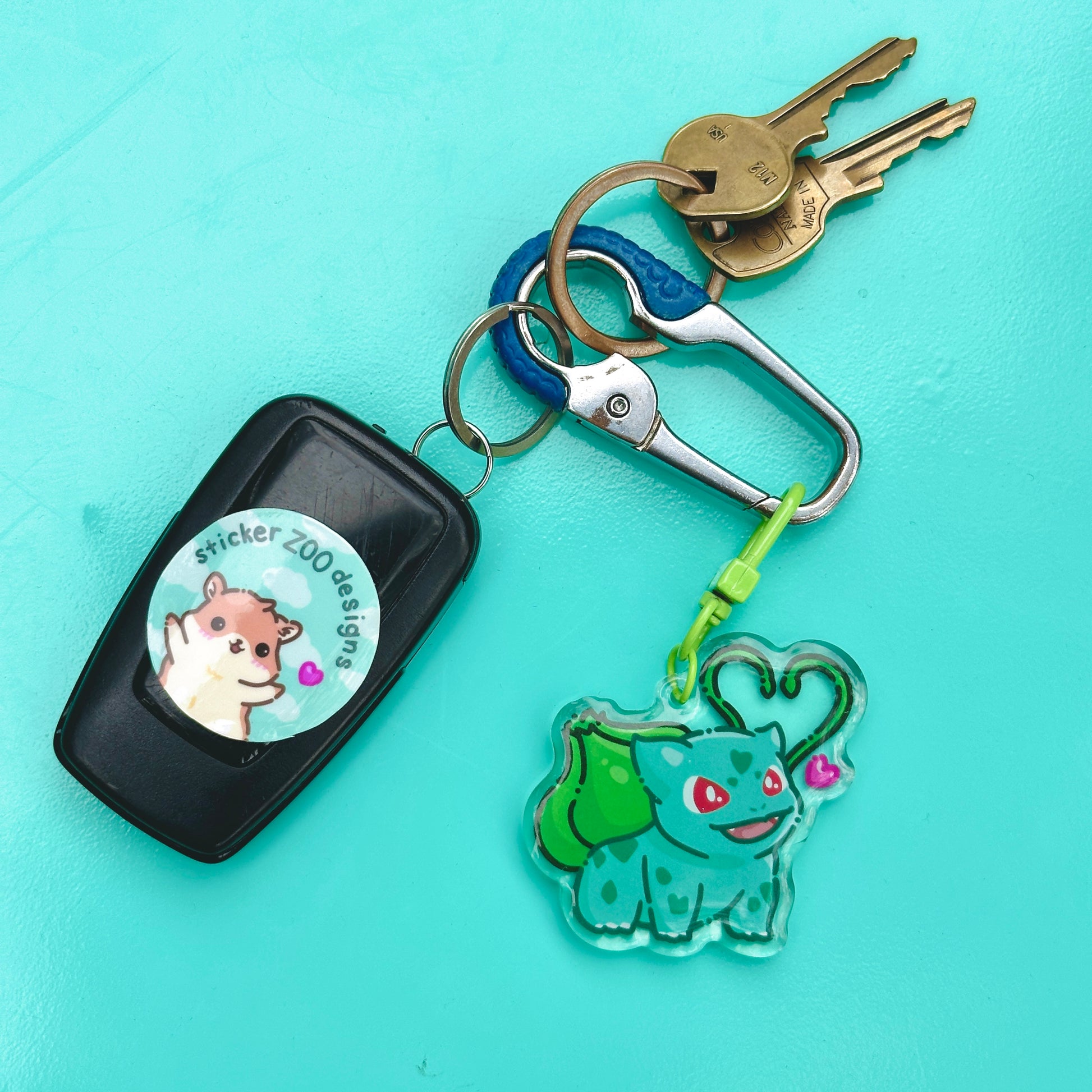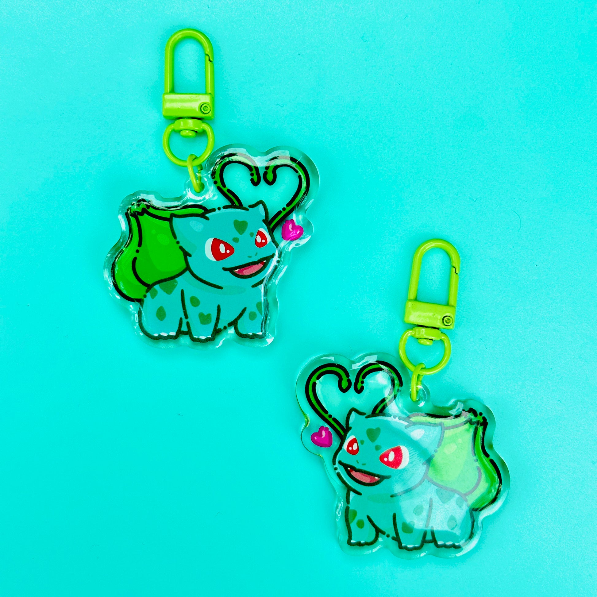 • Double-sided acrylic epoxy keychain with green clip.