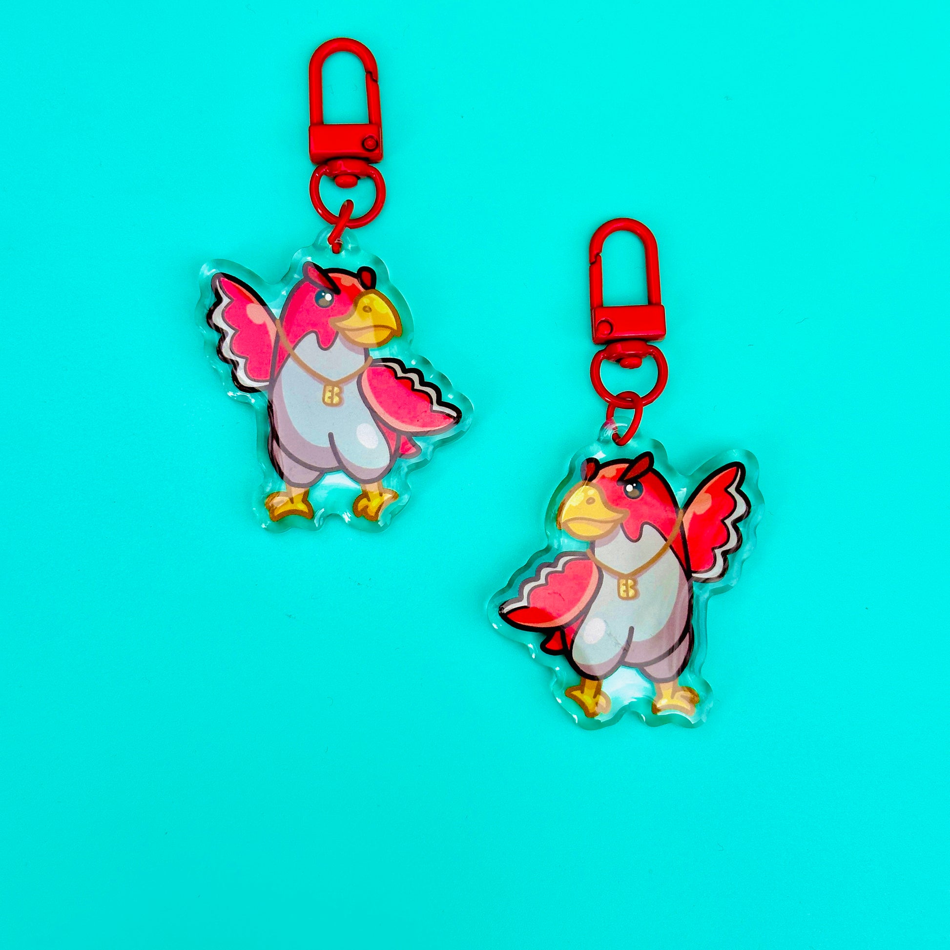 • Double-sided acrylic epoxy keychain with red clip.