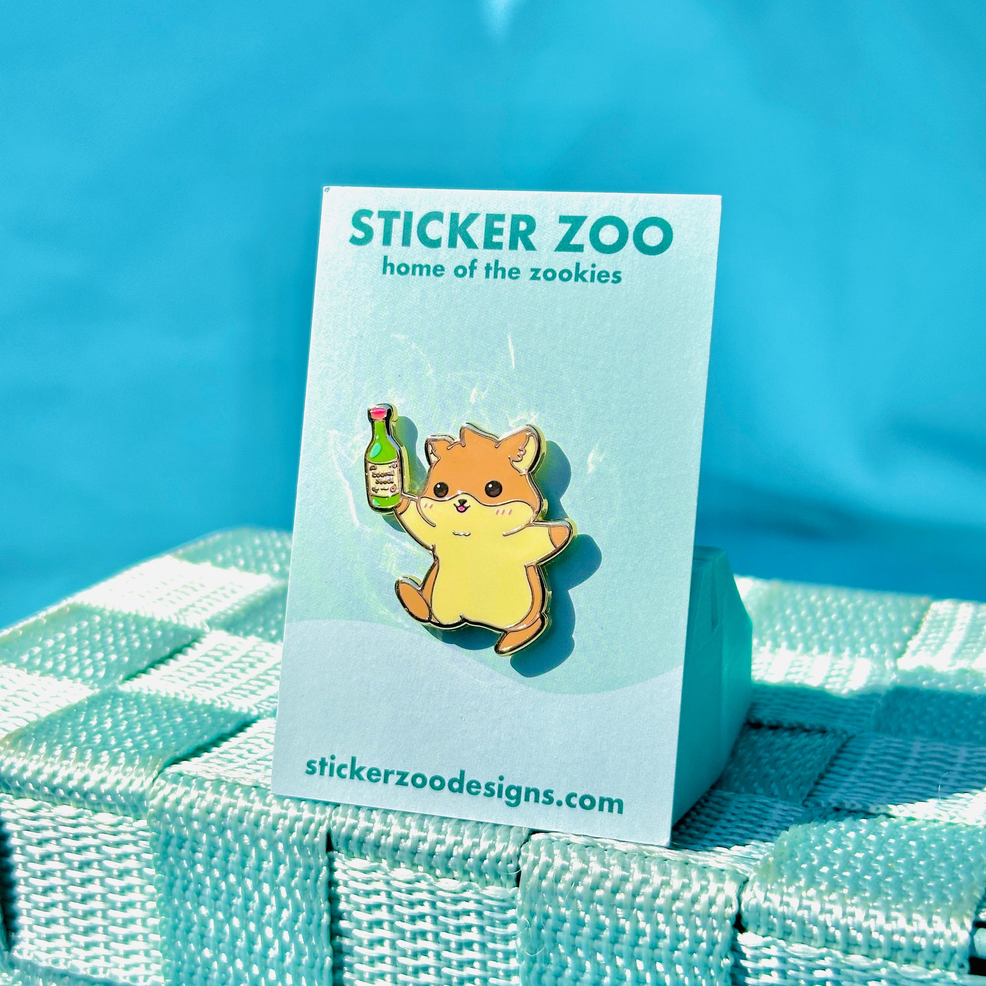 Gold-color, hard enamel pin based on my Original Character, Hemmy, the hamster, reaching for soju.