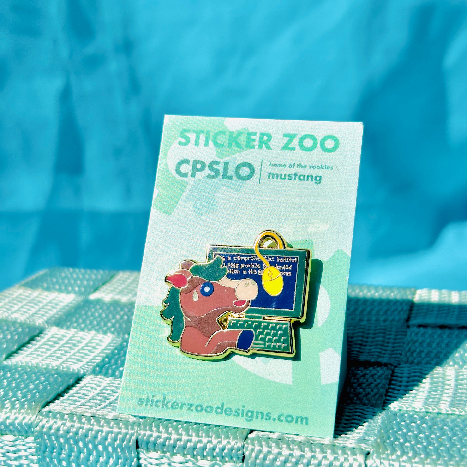 Gold-color, hard enamel pin of an horse/mustang based on the mascot of Cal Poly SLO with a computer and yellow mouse. The scripture on the laptop reads a line from the description for CPSLO.