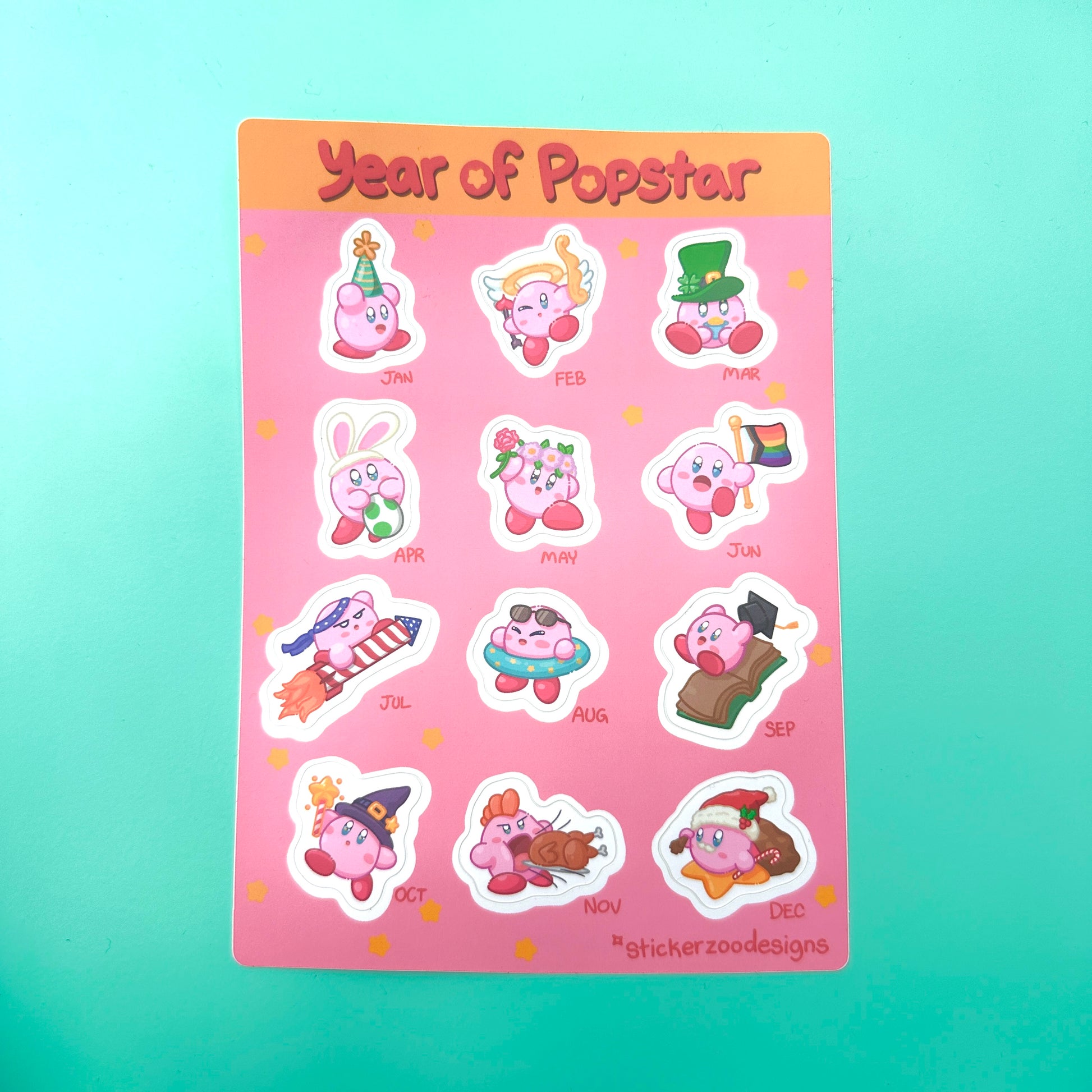 5"x7" Sticker Sheet based on a pink blob celebrating each month of the year in different forms.