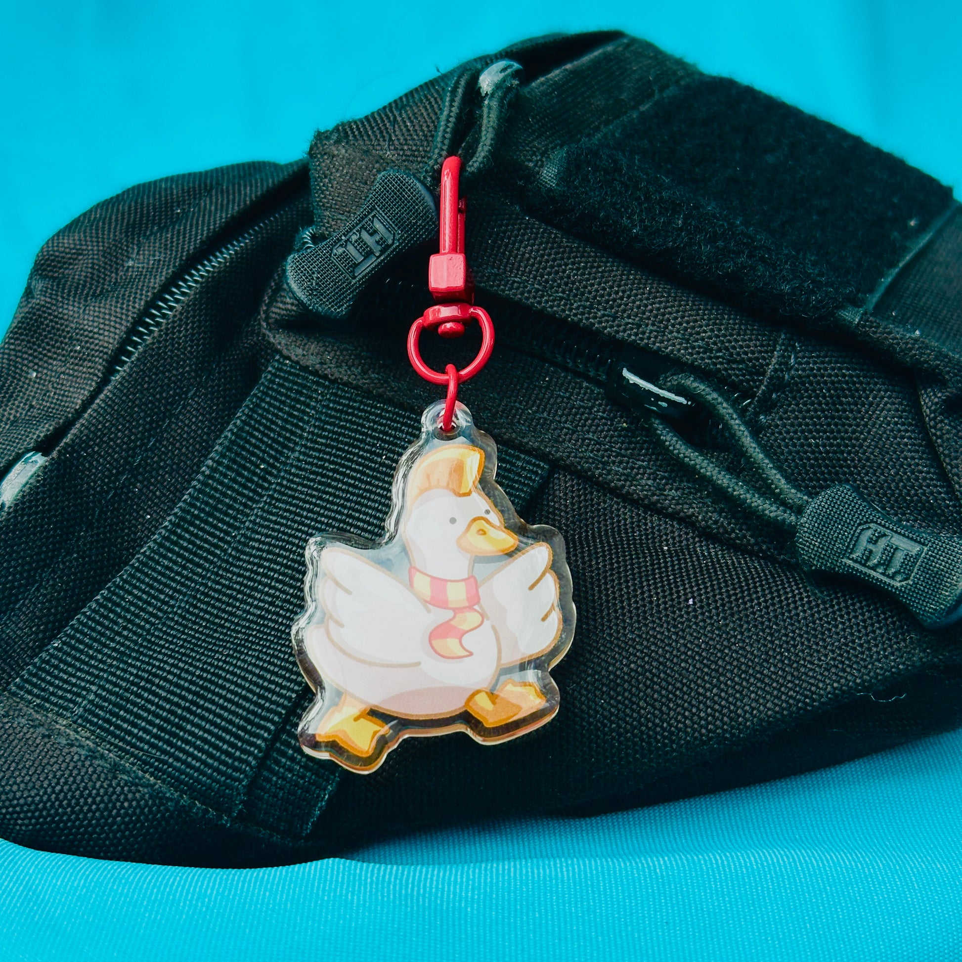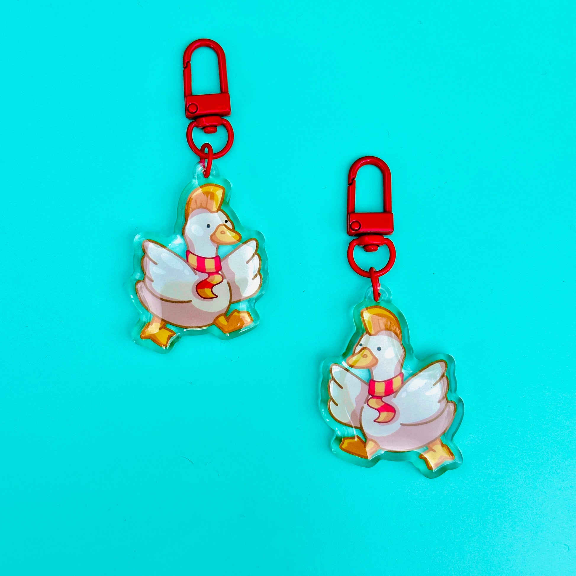 • Double-sided acrylic epoxy keychain with red clip.
