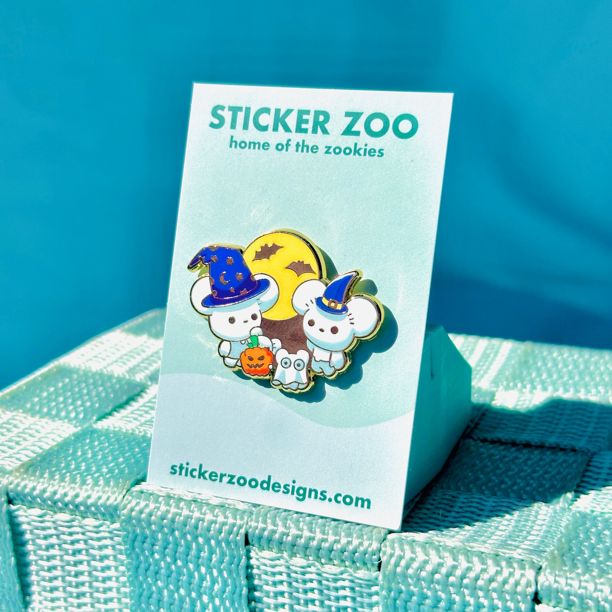 Gold-color, hard enamel pin based on white maus that are celebrating Halloween with witch hats.