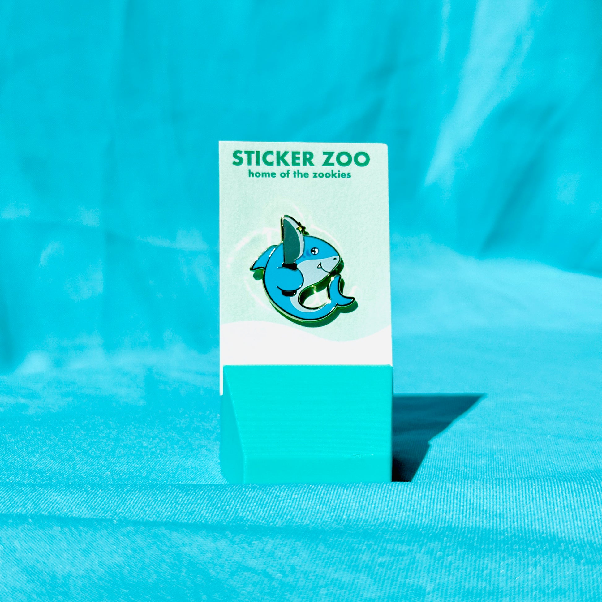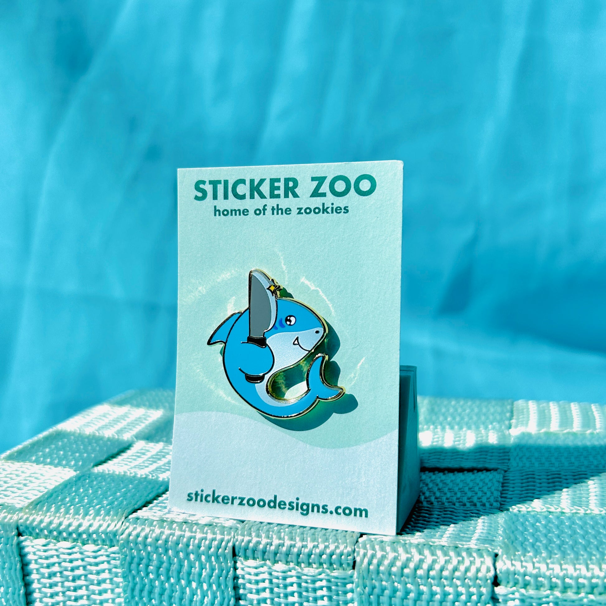 Gold-color, hard enamel pin of a cute shark wielding a butter knife!