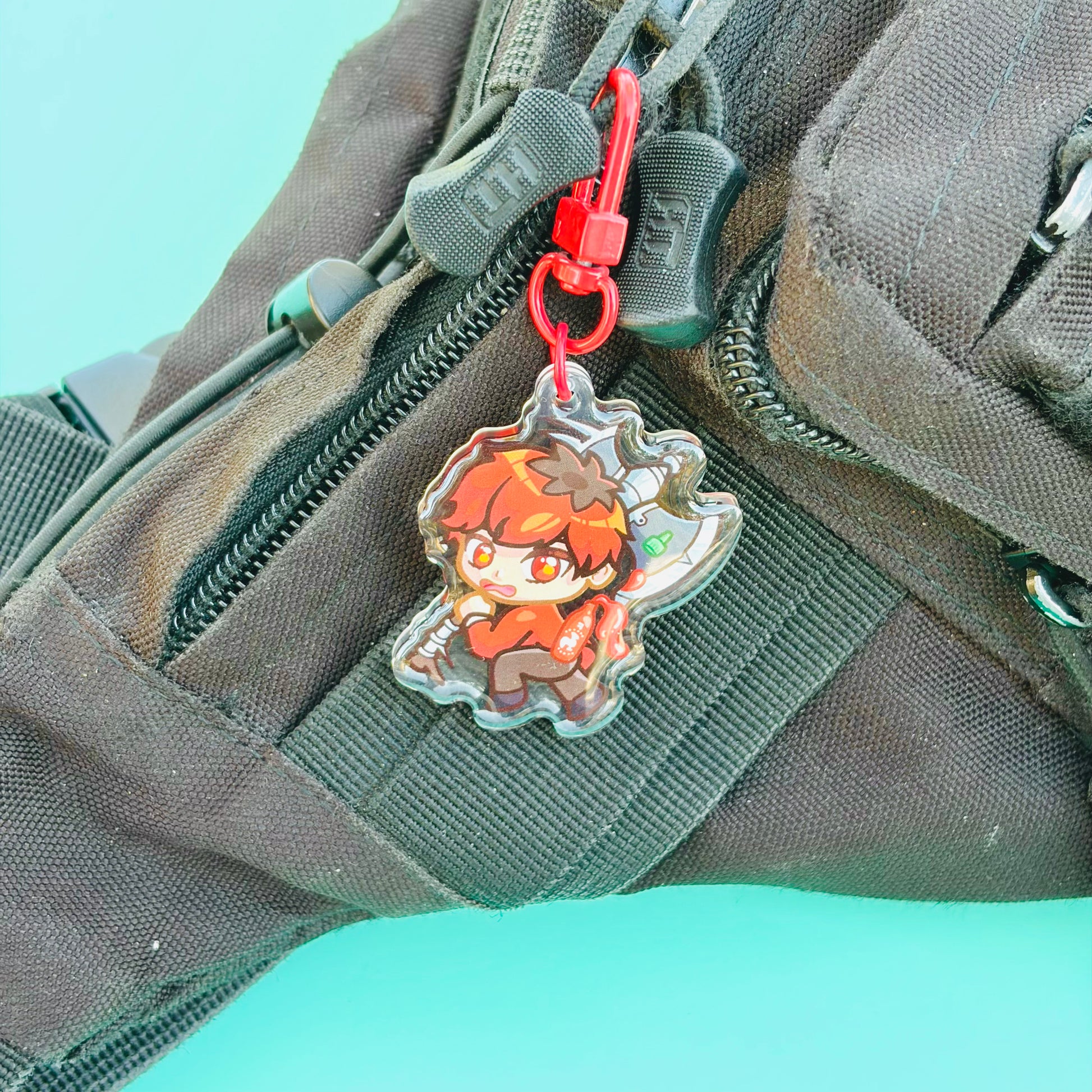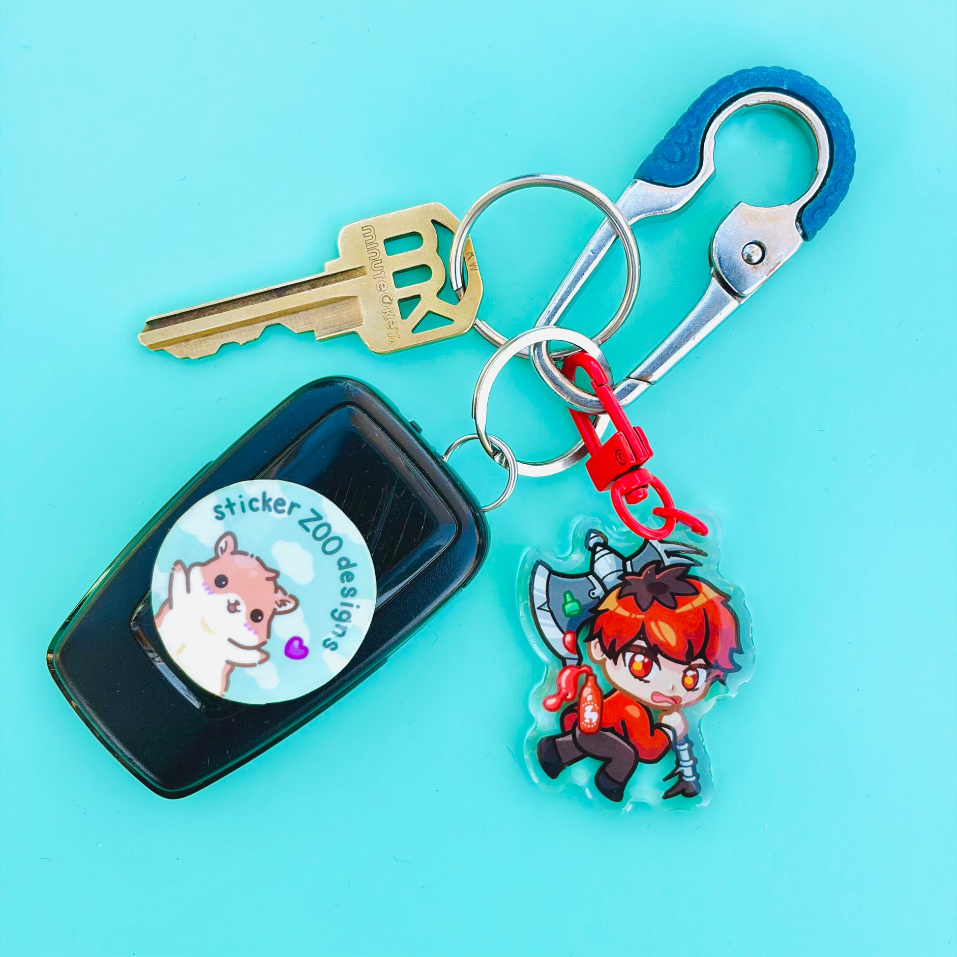 • Double-sided acrylic epoxy keychain with red clip.