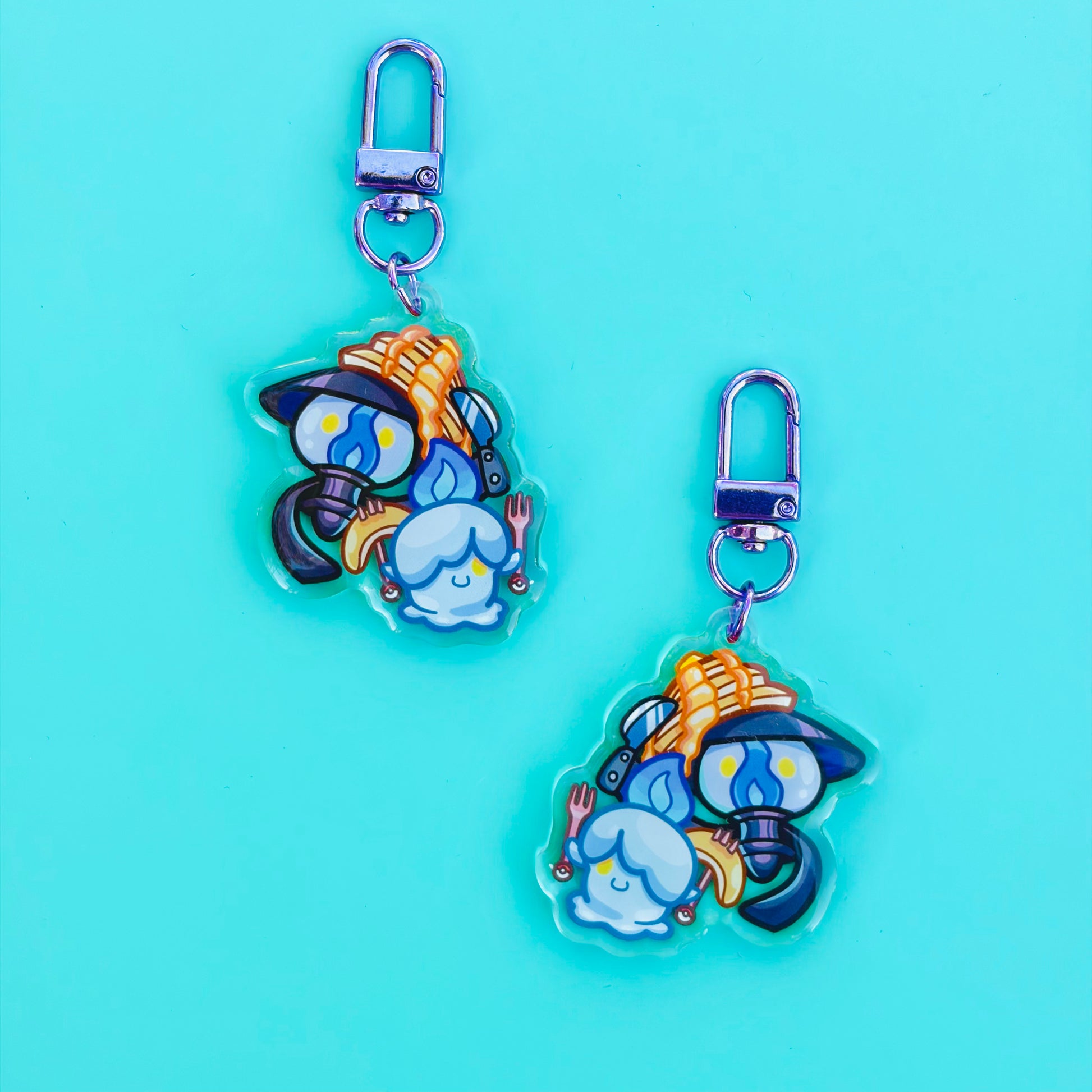 A cute design of both lampent and litwick together, eating pancakes for a hot breakfast!