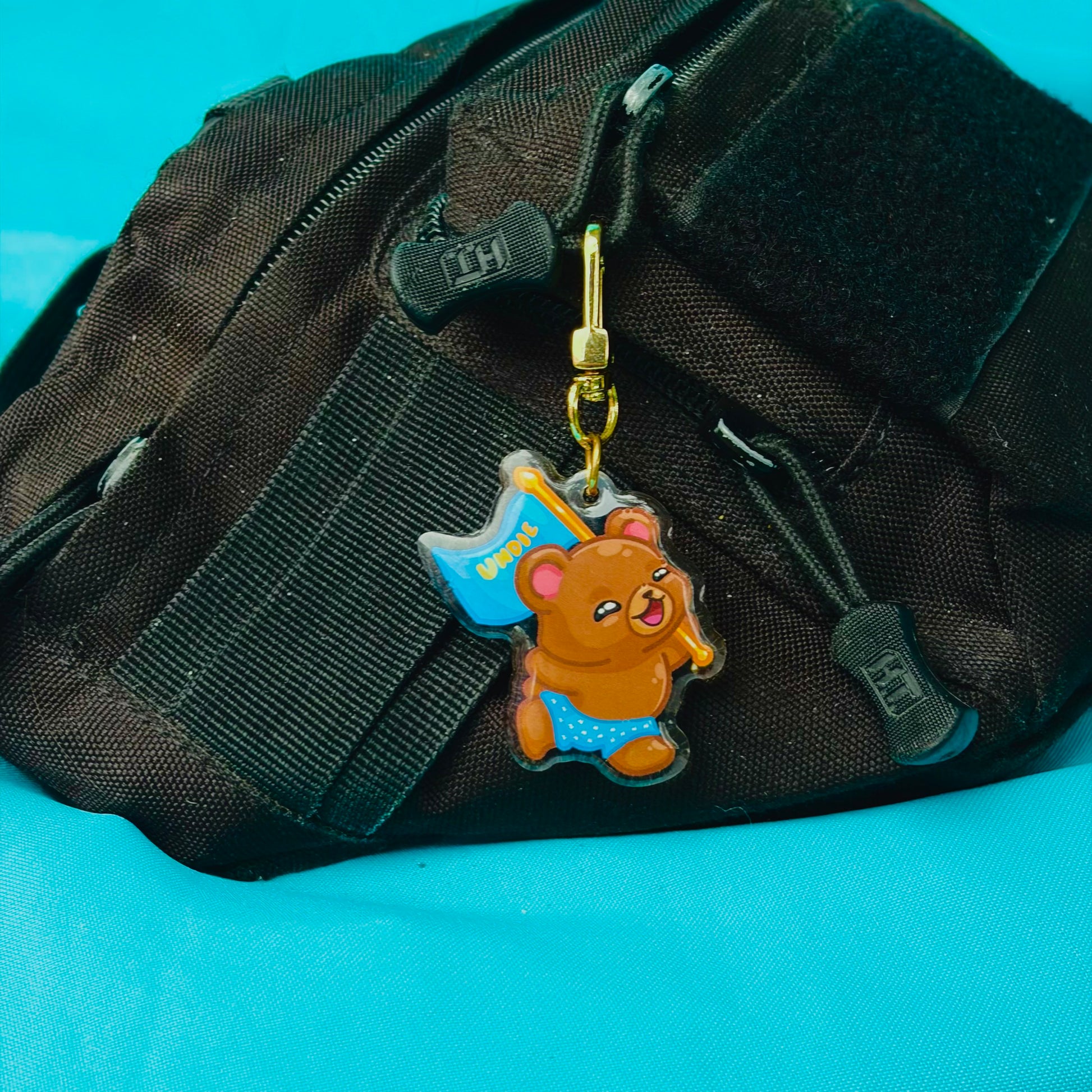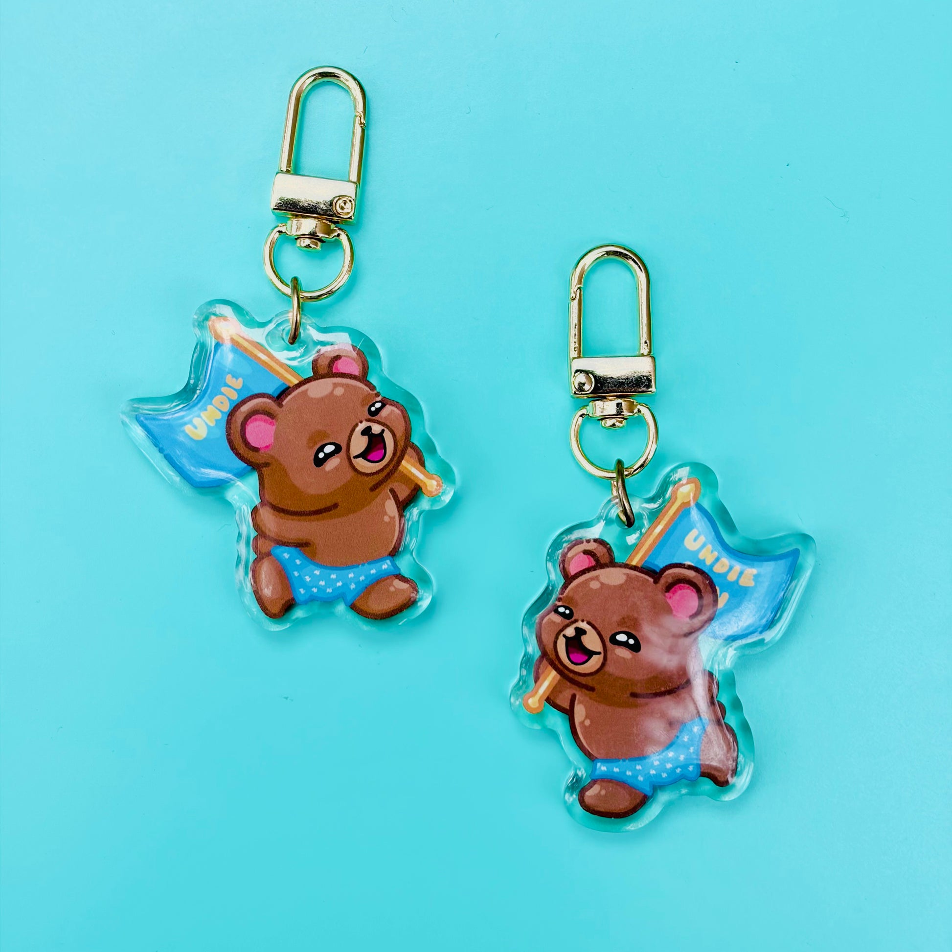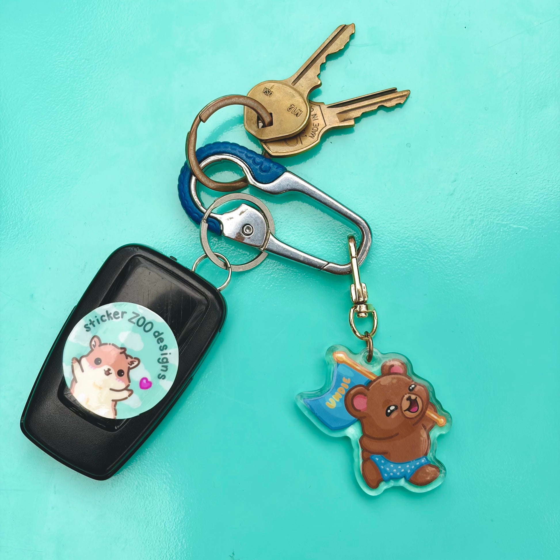 • Double-sided acrylic epoxy keychain with clip on gold chain