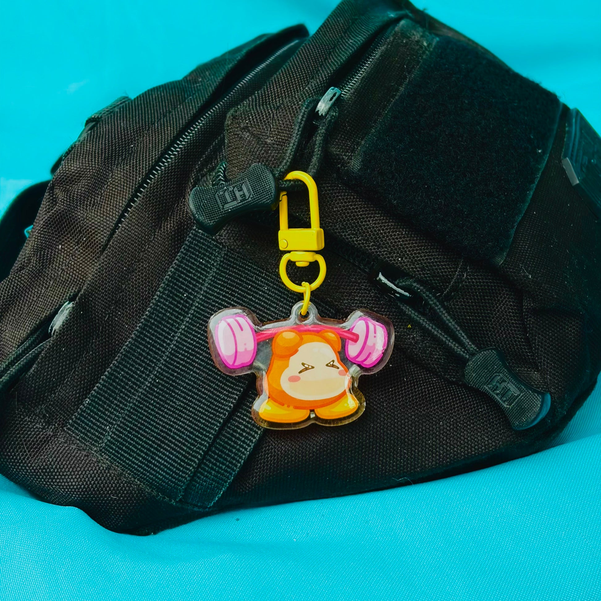 Cute orange monster lifting pink weights! An adorable charm for the strong and mighty.