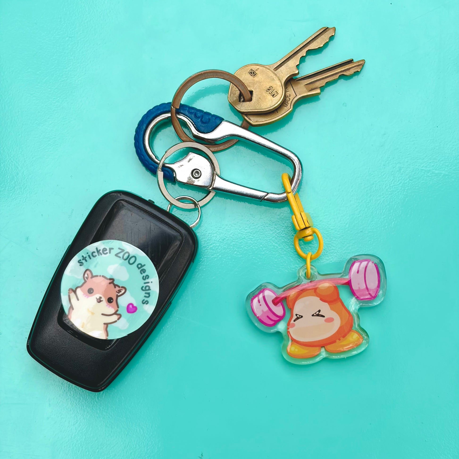 • Double-sided acrylic epoxy keychain with yellow clip.