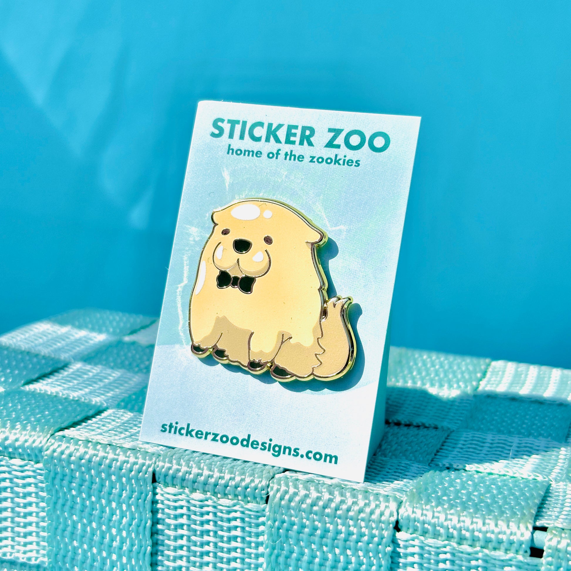 Gold-color, hard enamel pin based a white family dog that stays very loyal, sporting a cute black bowtie.