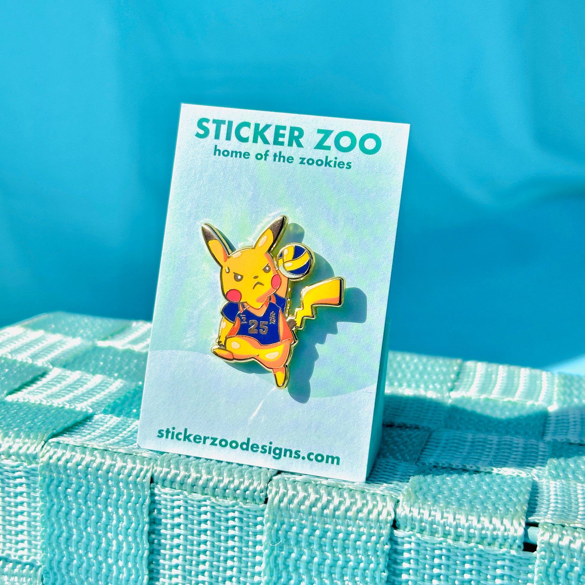 Gold-color, hard enamel pin based on yellow rat reaching high to spike a volleyball in a Karasuno jersey.